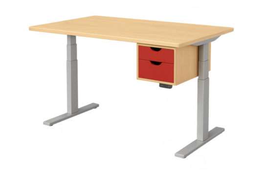 Adjustable standing desk with light wood top and two red drawers providing ergonomic workspace solution