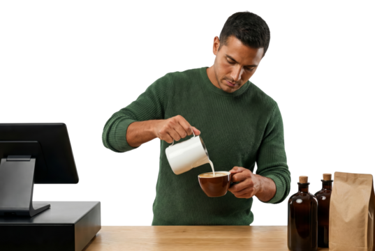 Serious businesswoman adjusting eyeglasses at desk with transparent background