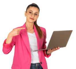 Typing text working using a laptop computer pc in the office A woman in a jacket and shirt student manager in the office happy, transparent background, png.