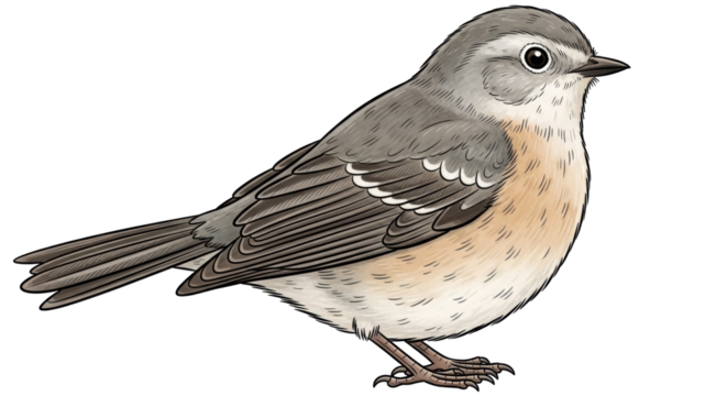 Isolated small bird with gray and tan feathers perching, profile view, artistic rendition