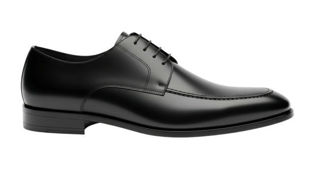 Highly polished black leather dress shoe is presented in a profile view against a dark background