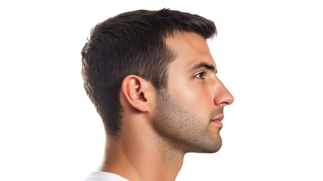 Close up side profile photo amazing he him his wondered macho perfect ideal appearance easy-going reliable person look calm not talk tell speak say wear casual white t-shirt isolated grey background