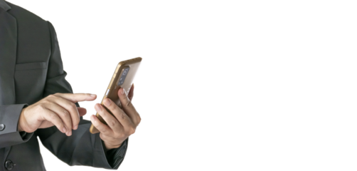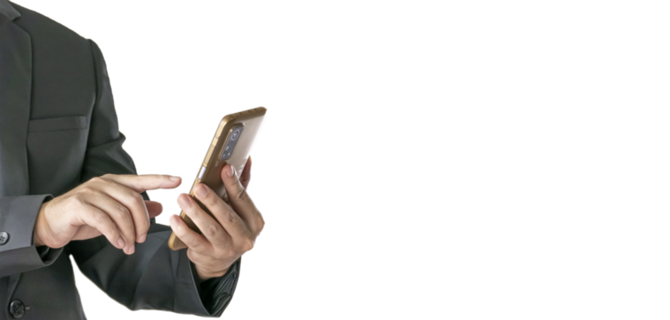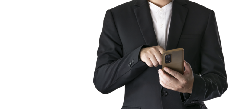 The Asian man in a black suit is standing alone and holding a phone.
