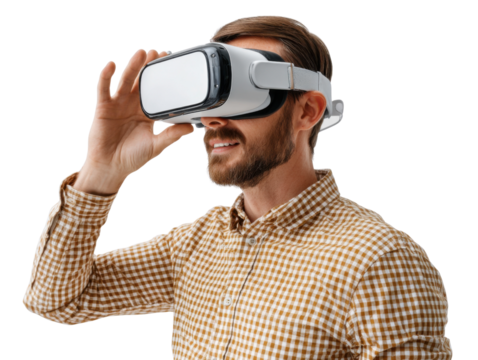 Immersive Virtual Reality Experience: A man is fully engrossed in an immersive virtual reality experience, exploring digital frontiers with cutting-edge technology and profound enthusiasm.