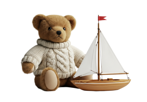 vintage brown teddy bear wearing a cream cable knit sweater next to a pine wooden toy sailboat, macro detail, high-key studio shot against a white background. concept of profound nostalgia and