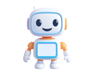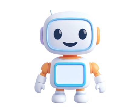 Cute 3D robot character with friendly smile, standing isolated. AI, technology, and future concept graphic.