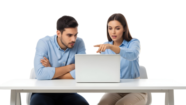Two colleagues collaborating on a laptop at a desk with a white background