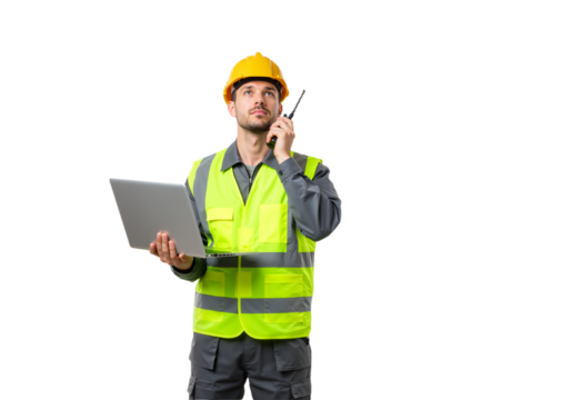 Construction worker analyzing blueprints on a table, focused and detailed approach, isolated background.