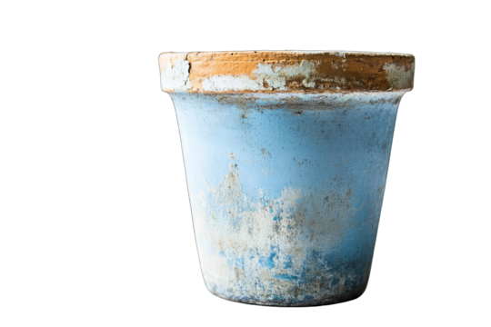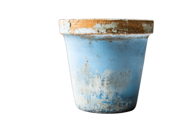 A weathered, pale-blue terracotta pot shows age with chipped paint and discoloration, suggesting prolonged outdoor use