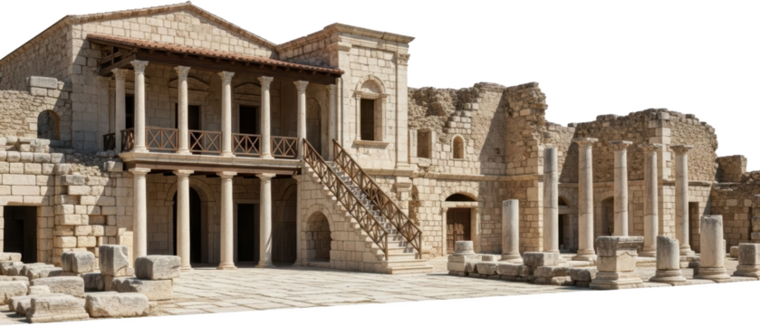 Ancient stone ruins showcasing classical architecture with columns a prominent two story facade exterior stairs and scattered building blocks on a sunlit courtyard Historic Archaeological
