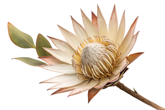 A stunning white protea flower with delicate petals and a prominent center, accompanied by green leaves, set against a clean white background.