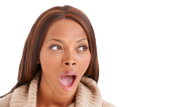 Surprise, wow or black woman with announcement or promotion isolated on transparent png background. Thinking, omg or mind blown face of African person shocked by sale discount, news or gossip secret