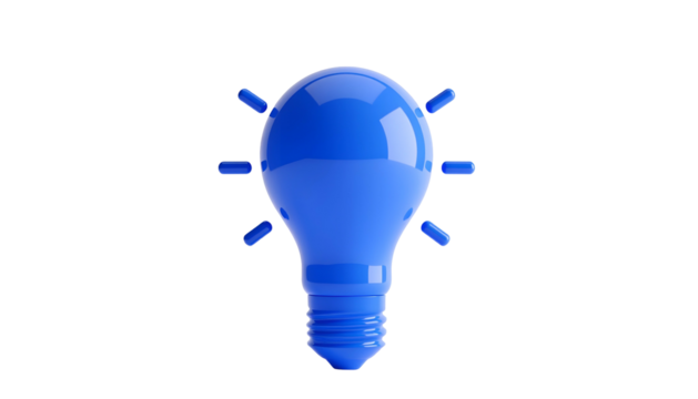 Shiny blue lightbulb with radiating prongs against a black background