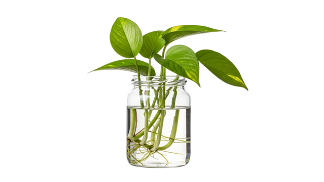 Golden Pothos cuttings with roots in a glass jar, isolated against a white background to highlight their propagation process and vibrant leaves