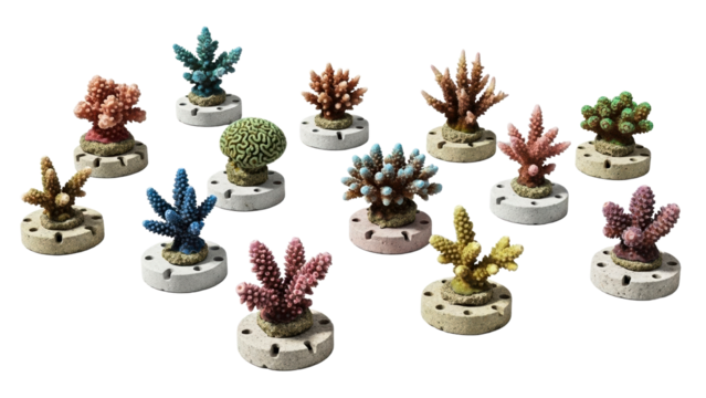 A vibrant assortment of colorful artificial coral fragments, showcasing diverse shapes and textures on individual stone bases, ideal for marine science and ecological conservation displays.
