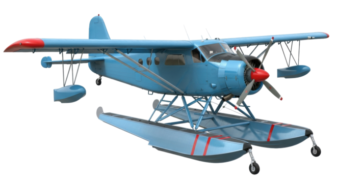 Isolated blue seaplane with floats, front view, ready to take off from the water, flying machine