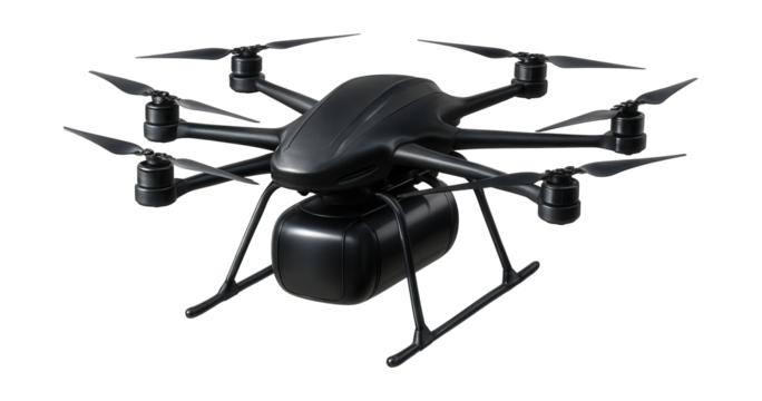 Octocopter drone featuring eight stable propellers and a cylindrical cargo compartment.