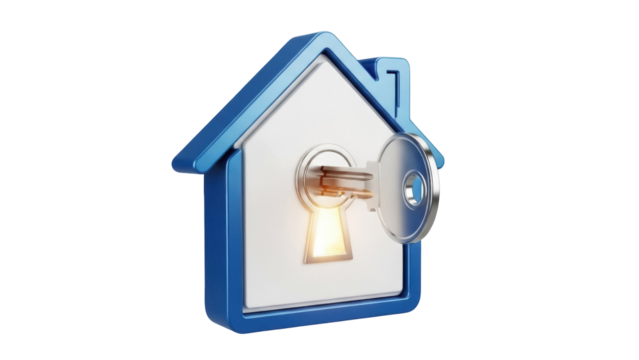 Blue house with key isolated PNG on transparent background, home security concept for real estate and property management