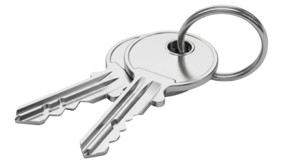 Two silver metal keys with keyring isolated on transparent background, security and access concept for graphic design PNG