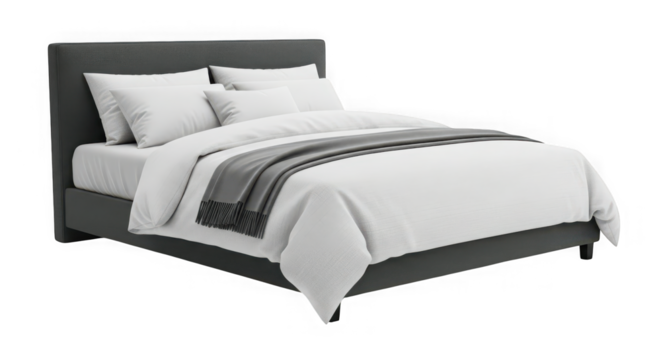 Cozy bedroom furniture arrangement featuring a dark armchair and a modern bed isolated on transparent background