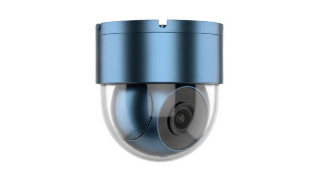 Blue dome security camera PNG isolated on transparent background, surveillance system for home safety and crime prevention