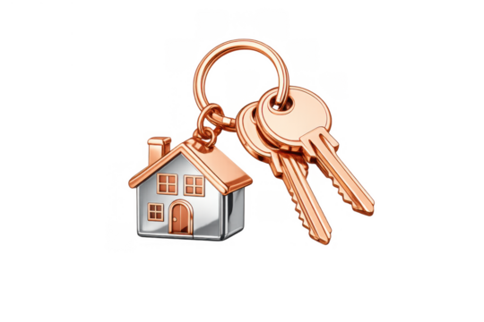 Rose gold house keys and a silver house keychain symbolizing real estate, home ownership, and mortgage security