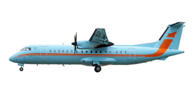 Light blue turboprop aircraft isolated on transparent background, regional airliner with orange stripes for travel and transportation