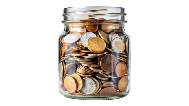 Glass jar filled with coins isolated on transparent background, representing savings, investment, and financial planning for a prosperous future