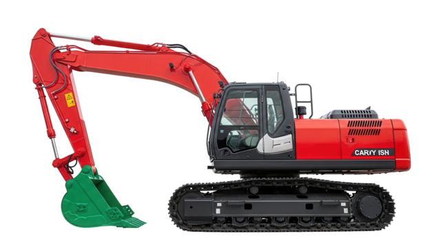 Isolated Red Excavator with Green Shovel for Heavy Construction and Industrial Projects