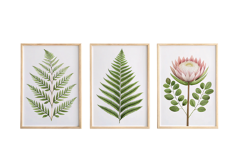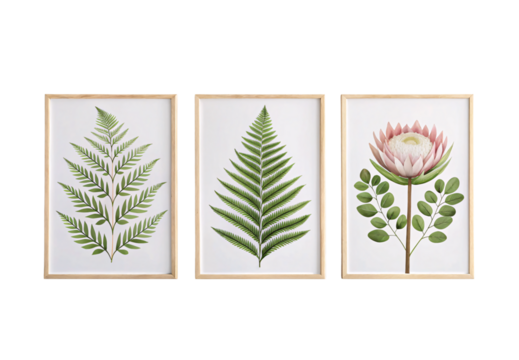 Three framed botanical illustrations showing two fern varieties and pink protea flower, isolated on a transparent background