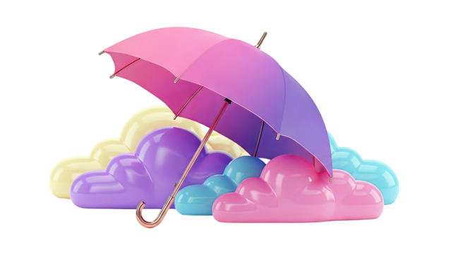3D Render of a Gradient Umbrella Over Colorful Cartoon Clouds