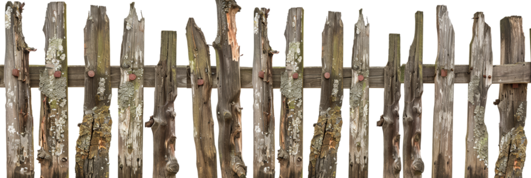 Weathered wooden fence, rustic and textured barrier with transparent background