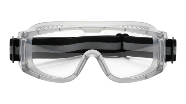 clear protective safety goggles with adjustable black strap and ventilation system for secure fit and comfort on transparent background