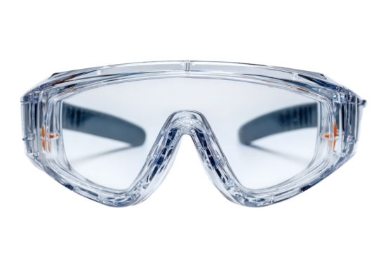 Protective eyewear: Close-up shot of essential safety glasses. It is a photorealistic image, showcasing every curve and detail of the protective eyewear, symbolizing focus and security.