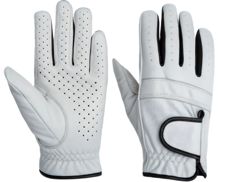 A pair of white leather golf gloves with ventilation holes laid flat on a  isolated on transparent background, Generative ai. showing palms