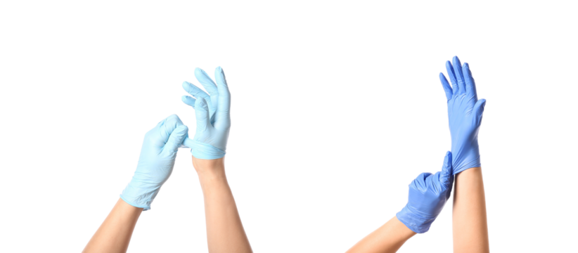 photograph of two hands in light blue latex gloves gesturing against a black backdrop in a studio setting suitable for healthcare campaigns