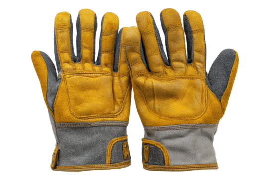 Pair of bright orange protective gloves, isolated on black, with raised stitched details and a slight sheen, representing safety