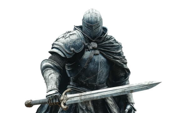 Warrior stands fiercely with sword raised in a confident pose strength and valor. Isolated on transparent background, png.