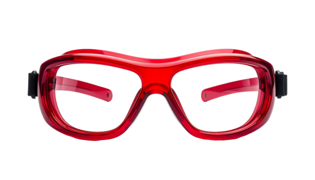 Close-up of protective eyewear, transparent lenses, sleek black frame, isolated on black