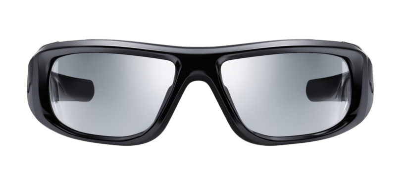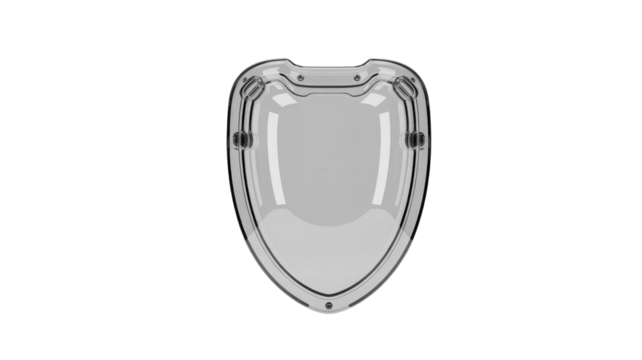 A clear, transparent, shield-shaped protective cover or visor, likely for a device or helmet, featuring visible attachment points on a dark transparent background. background removed