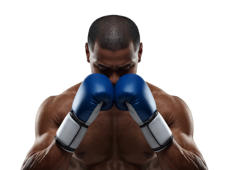Intense boxer in protective stance wearing blue gloves against transparent space