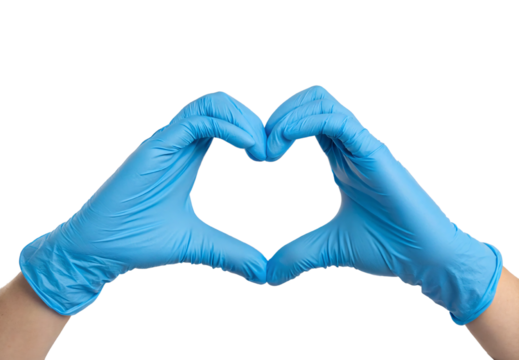 Blue medical gloves forming heart shape gesture, isolated on a transparent background