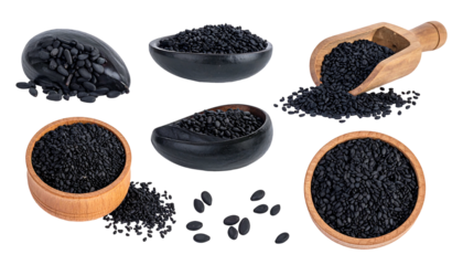 Bowls of black beans with a wooden scoop, isolated on a black backdrop, showing culinary ingredients and texture