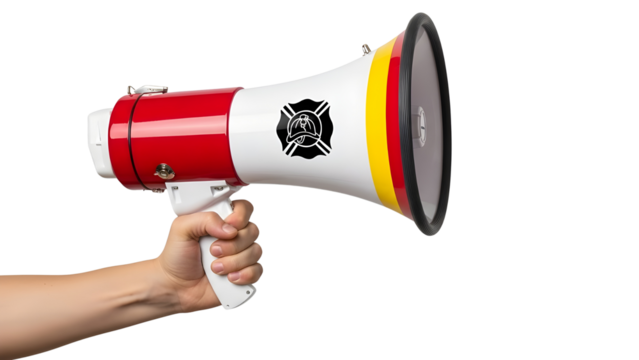 Hand holding a red and yellow megaphone with firefighter Maltese Cross symbol for urgent announcements isolated PNG with Transparent Background