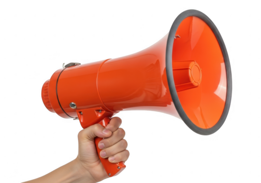 Hand holding a red and white megaphone announcing loudly with a clear message isolated on transparent background