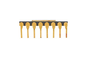 Side view of an integrated circuit in a black ceramic package with eight gold leads is isolated.