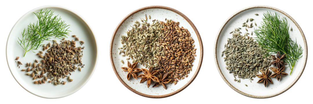 Three white plates with different spices on them