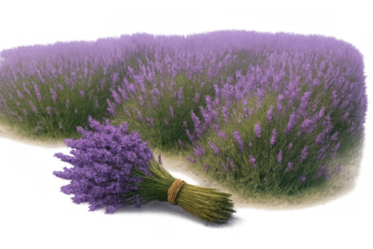 Lavender field growing vibrant purple flowers, a fresh cut bouquet resting on the ground, all on a transparent background