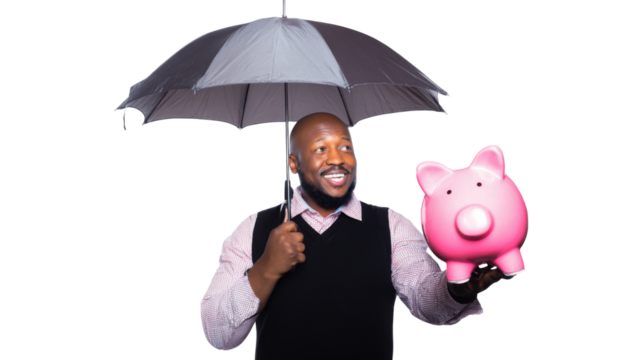 Financial Shield: A man shelters a pink piggy bank under an umbrella, symbolizing financial security and protection.