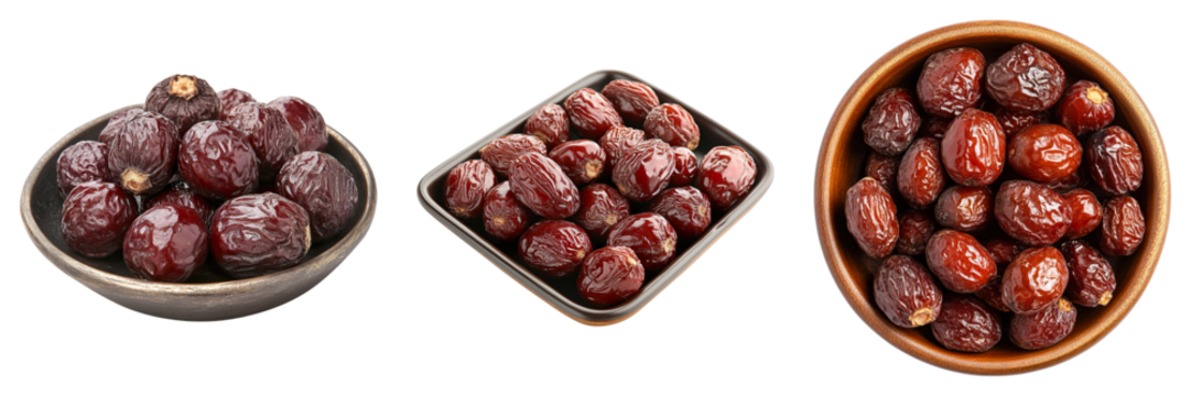 Three bowls of dried fruit, one of which is a mix of raisins and prunes